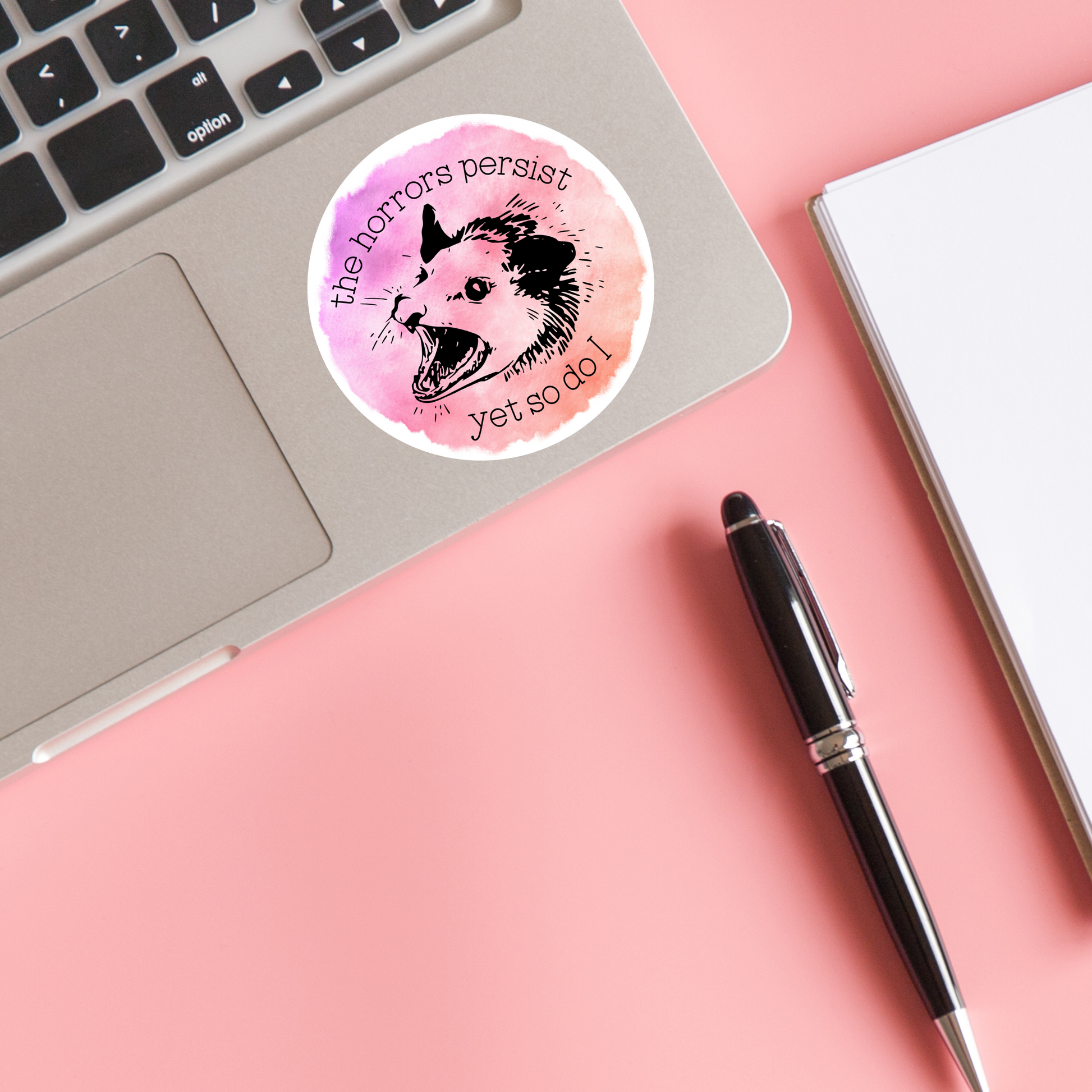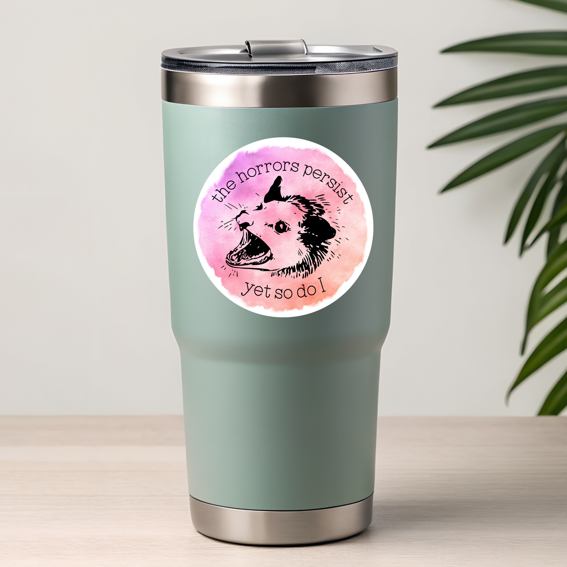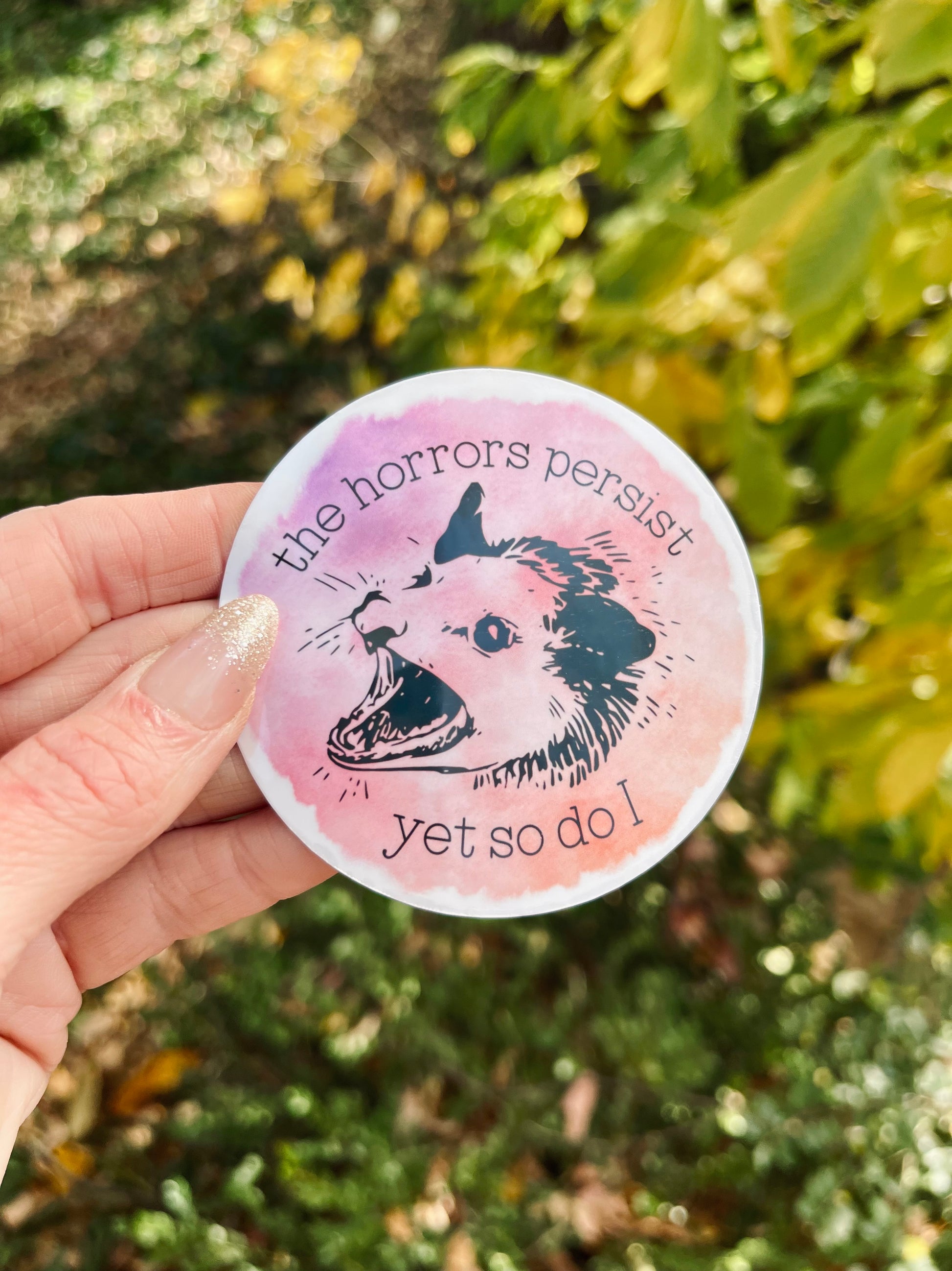 a painfully relatable possum, screaming into the void and carrying on anyway. perfect for anyone surviving out of pure spite.